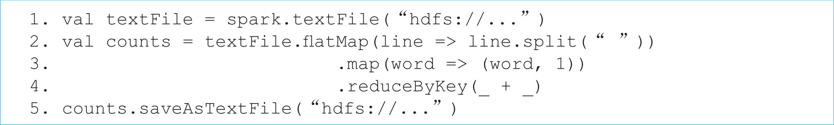用户代码可以是用户手写的MapReduce代码,或者是基于其他大数据处理框架的具体应用处理流程的代码。图1.3展示了在Hadoop MapReduce上实现WordCount的用户代码,其用于计算字符出现的次数。在Hadoop MapReduce上用户需要自定义map()和reduce()函数。除了map()和reduce()函数,用户为了优化应用性能还定义了一个“迷你”的reduce(),叫作combine()。combine()可以在reduce()执行之前对中间数据进行聚合,这样可以减少reduce()从各个节点获取的输入数据量,进而减少网络I/O开销和reduce()的压力。combine()和reduce()的代码实现一般是相同的。Hadoop MapReduce提供的map()和reduce()函数的处理逻辑比较固定单一,难以支持复杂数据操作,如常见的排序操作sort()、数据库表的关联操作join()等。为此,Dryad和Spark提供了更加通用的数据操作符,如flatMap()等。图1.4展示了在Spark上实现WordCount的用户代码,对于同样的应用处理逻辑,基于Spark的用户代码比基于Hadoop MapReduce的用户代码要更加简洁。