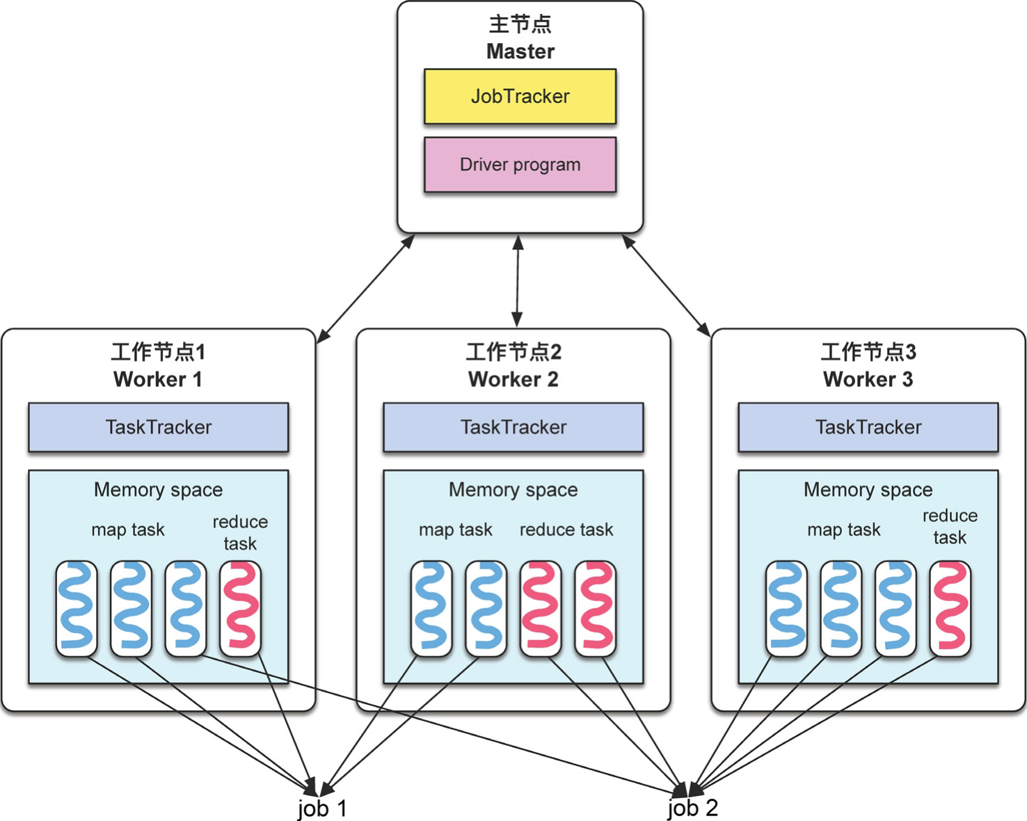 图1.8 Hadoop MapReduce框架的部署图,其中不同job的task可以分布在不同机器上