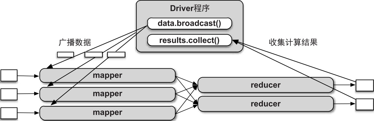 在实际系统中,用户撰写用户代码后,大数据处理框架会生成一个Driver程序,将用户代码提交给集群运行。例如,在Hadoop MapReduce中,Driver程序负责设定输入/输出数据类型,并向Hadoop MapReduce框架提交作业;在Spark中,Driver程序不仅可以产生数据、广播数据给各个task,而且可以收集task的运行结果,最后在Driver程序的内存中计算出最终结果。图1.5展示了在Spark平台上Driver程序的运行模式。