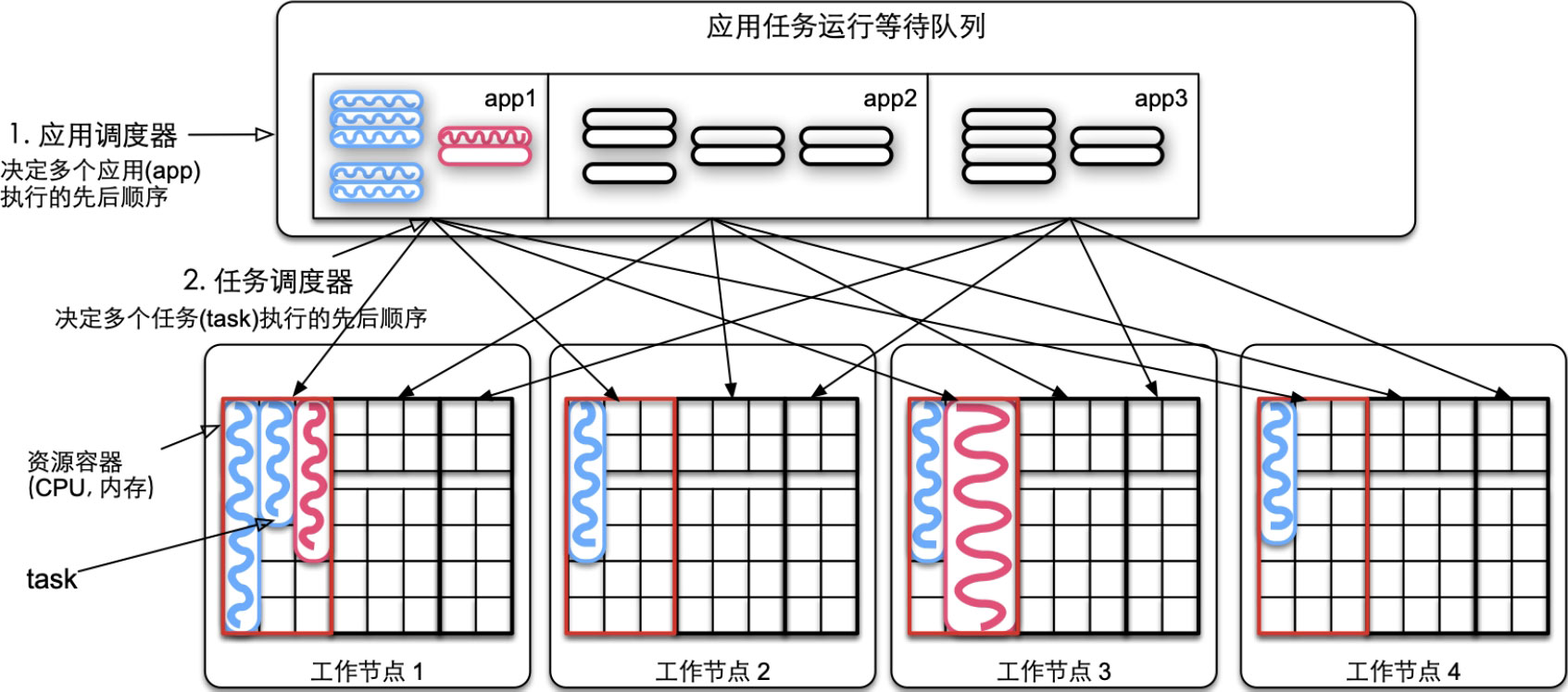 在运行大数据应用前,大数据处理框架还需要对用户提交的应用(job)及其计算任务(task)进行调度。任务调度的主要目的是通过设置不同的策略来决定应用或任务获得资源的先后顺序。典型的任务调度器包含先进先出(FIFO)调度器、公平(Fair)调度器等。先进先出(FIFO)的任务调度器如图1.9所示,其有两种类型的调度器:一类是应用调度器,决定多个应用(app)执行的先后顺序;另一类是任务调度器,决定多个任务(task)执行的先后顺序。例如,Spark中一个stage可能包含多个map task,任务调度器可以根据数据本地化等信息决定这些task应调度到的执行节点。