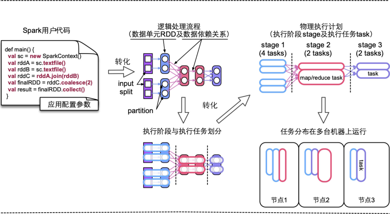 为了将逻辑处理流程转化为物理执行计划,Spark首先根据RDD之间的数据依赖关系,将整个流程划分为多个小的执行阶段(stage)。例如,图1.7中逻辑处理流程被划分为3个执行阶段。之后,在每个执行阶段形成计算任务(task),计算任务的个数一般与RDD中分区的个数一致。与MapReduce不同的是,一个Spark job可以包含很多个执行阶段,而且每个执行阶段可以包含多种计算任务,因此并不能严格地区分每个执行阶段中的任务是map任务还是reduce任务。另外,在Spark中,用户可以通过调用cache()接口使框架缓存可被重用的中间数据。例如,当前job的输出可能会被下一个job用到,那么用户可以使用cache()对这些数据进行缓存。