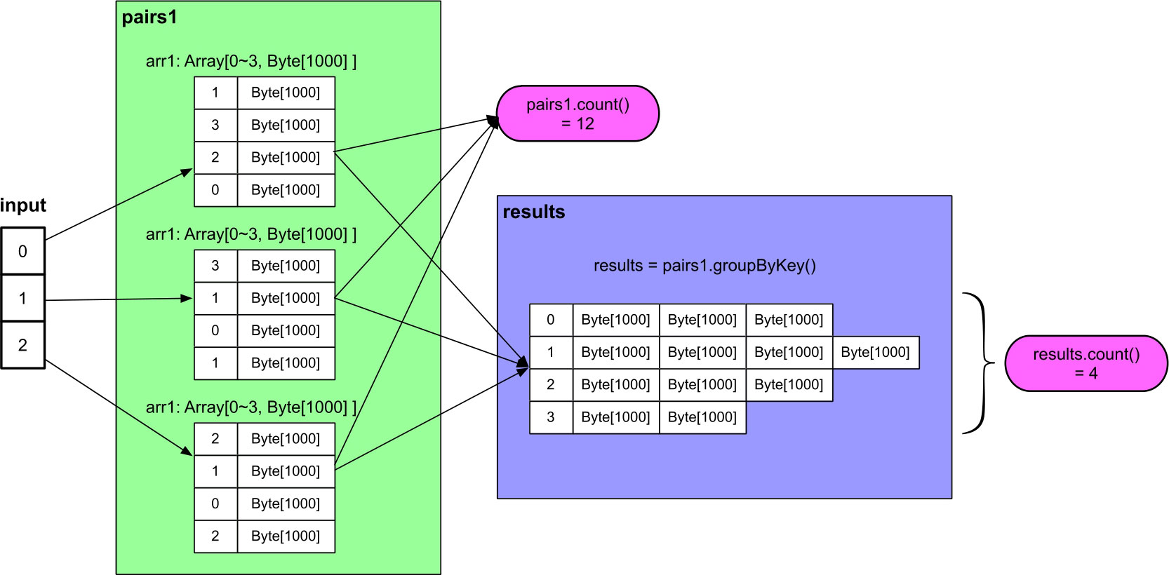 ■使用sparkContext.parallelize(0 until numMappers,numMappers)将[0,1,2]划分为3份,也就是每一份包含一个数字 p ={ p =0, p =1, p =2}。接下来flatMap()的计算逻辑是对于每一个数字 p (如 p =0),生成一个数组arr1:Array[(Int,Byte[])],数组长度为numKVPairs=4。数组中的每个元素是一个(Int,Byte[])对,其中Int为[0,3]上随机生成的整数,Byte[]是一个长度为1000的数组。因为 p 只有3个值,所以该程序总共生成3个arr1数组,被命名为pairs1,pairs1被声明为需要缓存到内存中。