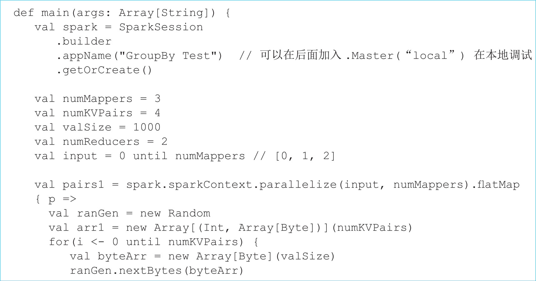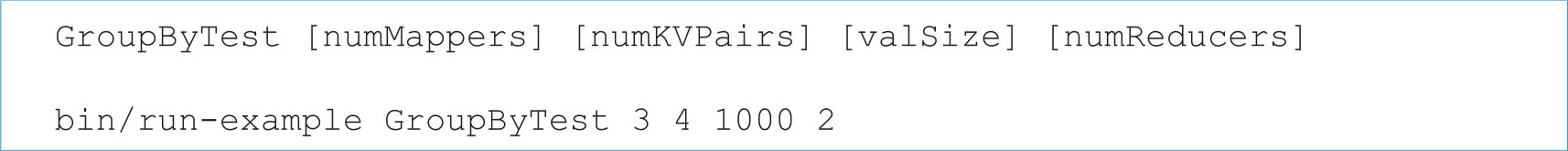 我们以Spark自带的example包中的GroupByTest.scala为例,这个应用模拟了SQL中的GroupBy语句,也就是将具有相同Key的<;Key,Value>;record(其简化形式为<;K,V>;record)聚合在一起。输入数据由GroupByTest程序自动生成,因此需要提前设定需要生成的<;K,V>;record个数、Value长度等参数。假设在Master节点上提交运行GroupByTest,具体参数和执行命令如下: