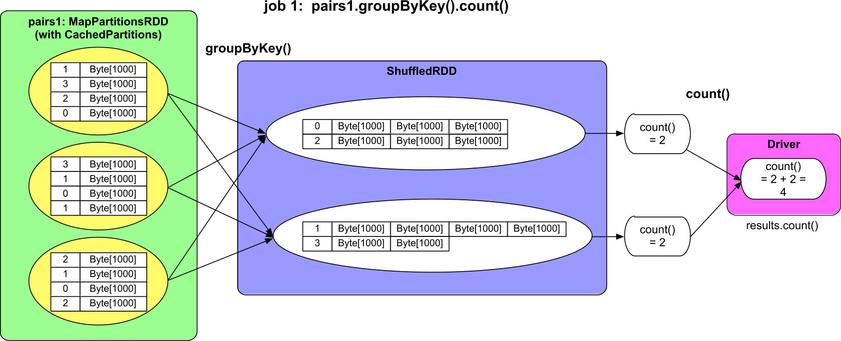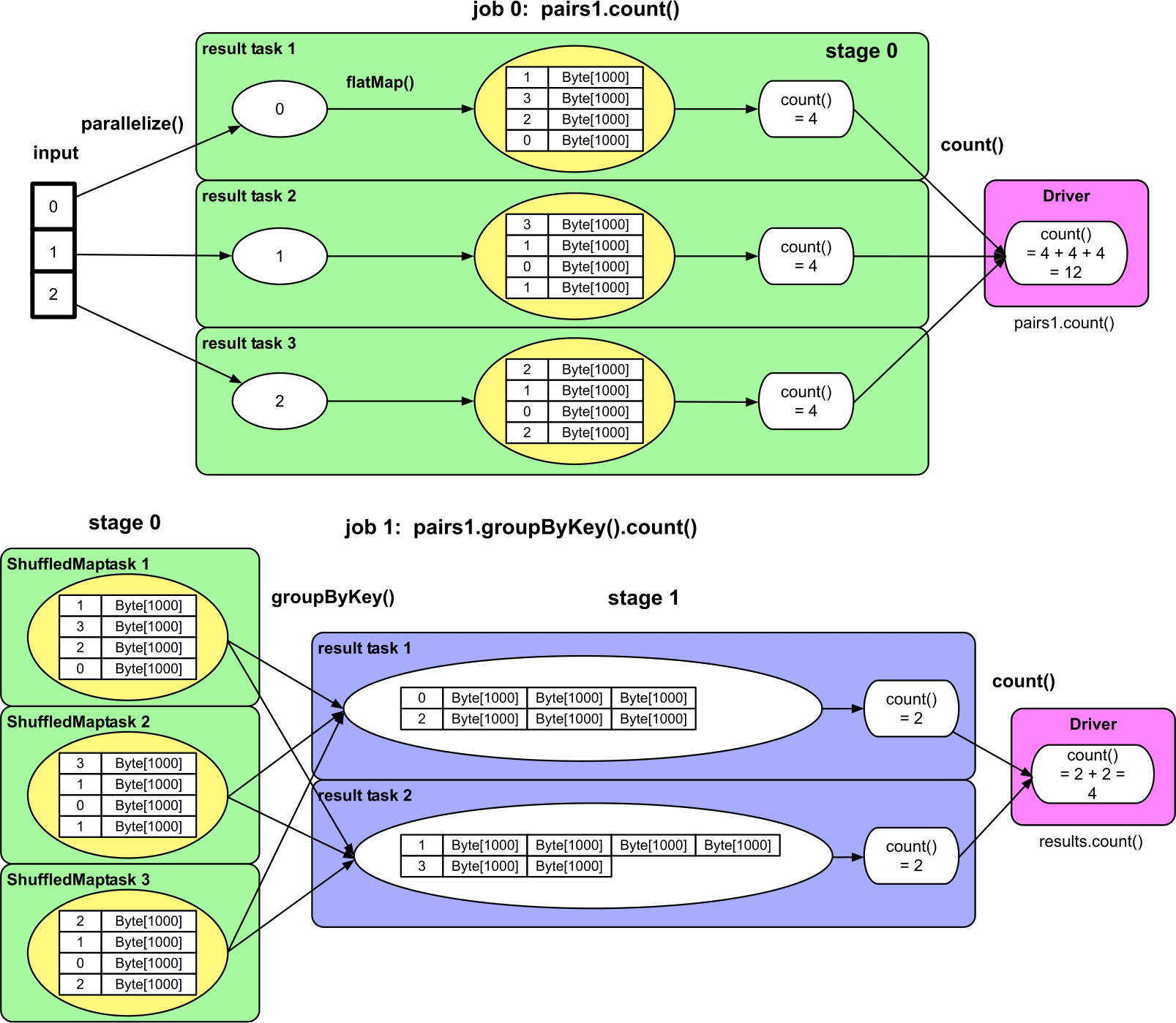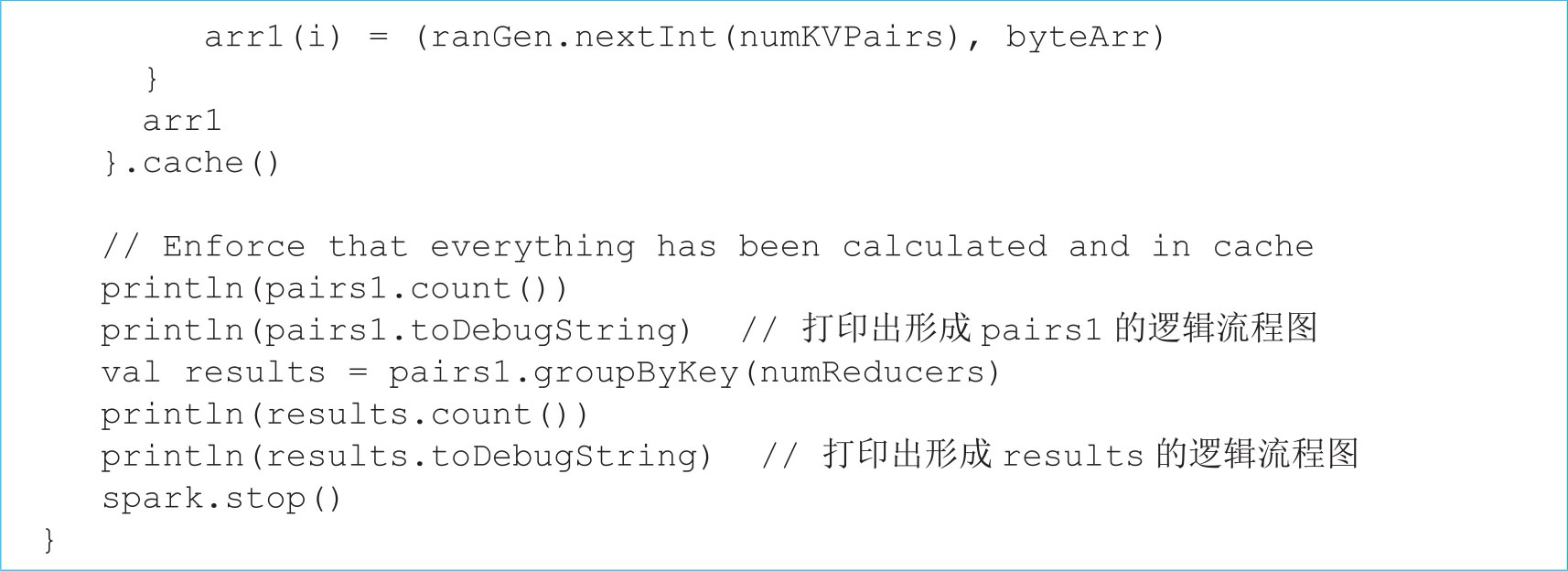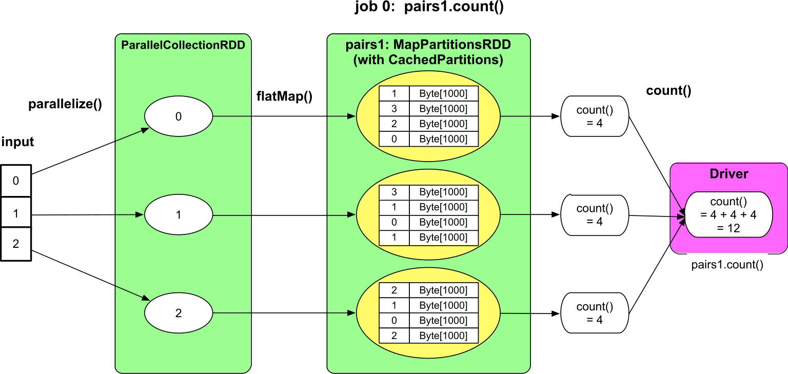 ■接下来执行一个action()操作pairs1.count(),来统计pairs1中所有arr1中的元素个数,执行结果应该是numMappers*numKVPairs=3×4=12。这一步除了计算count结果,还将每个pairs1中的3个arr1 数组缓存到内存中,便于下一步计算。需要注意的是,缓存操作在这一步才执行,因为pairs1实际在执行action()操作后才会被生成,这种延迟(lazy)计算的方式与普通Java程序有所区别。action()操作的含义是触发Spark执行数据处理流程、进行计算的操作,即需要输出结果,更详细的含义将在下一章中介绍。