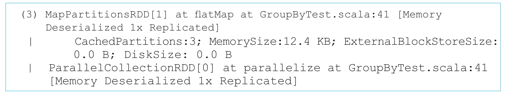 第一行的“(3) MapPartitionsRDD[1]”表示的是pairs1,即pairs1的类型是MapPartitions-RDD,编号为[1],共有3个分区(partition),这是因为pairs1中包含了3个数组。由于设置了pairs1.cache,所以pairs1中的3个分区在计算时会被缓存,其类型是CachedPartitions。那么pairs1是怎么生成的呢?我们看到描述“MapPartitionsRDD[1] at flatMap at GroupByTest.scala:41”,即pairs1是由flatMap()函数生成的,对照程序代码,可以发现确实是input.parallelize().flatMap()生成的。接着出现了“ParallelCollectionRDD[0]”,根据描述是由input.parallelize()函数生成的,编号为[0],因此,我们可以得到结论:input.parallelize()得到一个ParallelCollectionRDD,然后经过flatMap()得到pairs1:MapPartitionsRDD。