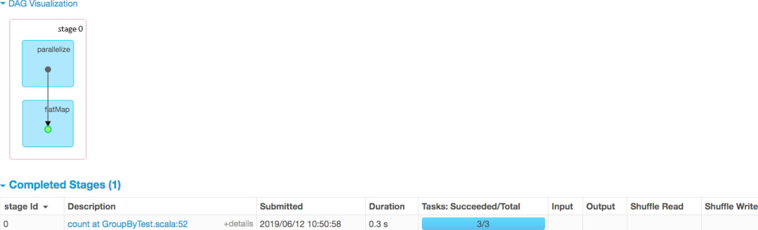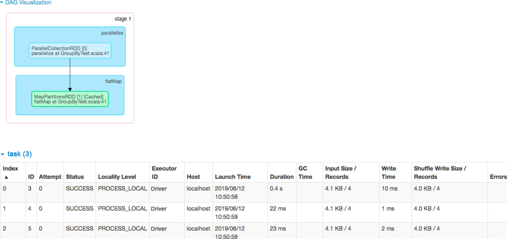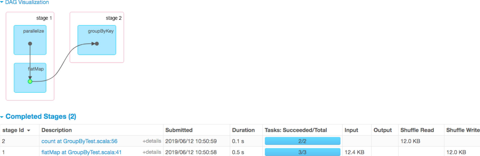 同样,第1行的“(2) ShuffledRDD[2]”表示的是results,即results的类型是ShuffledRDD,由groupByKey()产生,共有两个分区(partition),这是因为在groupByKey()中,设置了partition number=numReducers=2。接着出现了“MapPartitionsRDD [1]”,这个就是之前生成的pairs1。接下来的ParallelCollectionRDD由input.parallelize()生成。