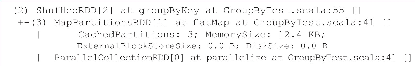 ■在已经被缓存的MapPartitionsRDD上执行groupByKey()操作,产生了另外一个名为ShuffledRDD的中间数据,也就是results,产生这个RDD的原因会在后面章节中讨论。这里我们将ShuffledRDD换了一种颜色表示,是因为ShuffledRDD与MapPartitionsRDD具有不同的分区个数,这样MapPartitionsRDD与ShuffledRDD之间的分区关系就不是一对一的,而是多对多的了,是多对多关系的原因会在后续章节中讨论。
