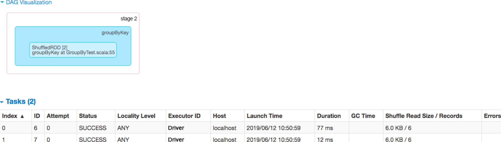 对于stage 2,单击图2.8中的“count at GroupByTest.scala:56”进入Details for stage 2界面,得到图2.10。与我们在2.3.2节中给出的逻辑处理流程一致,在进行groupByKey()操作后生成了ShuffledRDD。stage 2包含两个task,每个task包含一个Shuffle Read Size的属性,表示从stage 1的输出结果中Shuffle Read的数据。每个task获取了6个record,与我们画出的物理执行计划一致。