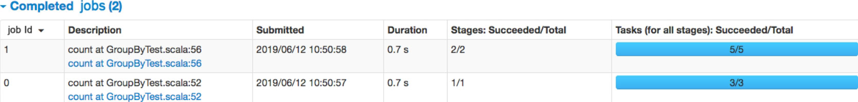 (1)首先确定应用会产生哪些作业(job)。在GroupByTest中,有两个count()的action()操作,因此会产生两个job。