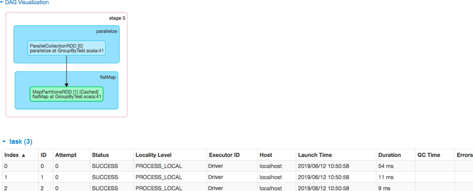 为了进一步分析该stage中的数据关联关系和生成的task,我们可以单击图2.6中的“count at GroupByTest.scala:52”进入Details for stage 0界面。如图2.7所示,发现stage 0中包含两个RDD,parallelize()操作生成了ParallelCollectonRDD,flatMap()操作生成了MapRartitionsRDD,并对该RDD进行缓存。cached说明该RDD已经被缓存到内存中。这里没有显示这些RDD有几个分区,但是我们看到该stage有3个task,可以断定分区个数为3。task中还有一些属性,如Attempt、Locality Level、GC Time等,我们在后续章节中再详细讨论。