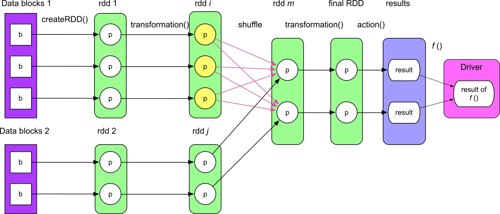 (4)计算结果处理:由于RDD实际上是分布在不同机器上的,所以大数据应用的结果计算分为两种方式:一种方式是直接将计算结果存放到分布式文件系统中,如rdd.save(“hdfs://file_location”),这种方式一般不需要在Driver端进行集中计算;另一种方式是需要在Driver端进行集中计算,如统计RDD中元素数目,需要先使用多个task统计每个RDD中分区(partition)的元素数目,然后将它们汇集到Driver端进行加和计算。例如,在图3.1中,每个分区进行action()操作得到部分计算结果result,然后将这些result发送到Driver端后对其执行 f ()函数,得到最终结果。