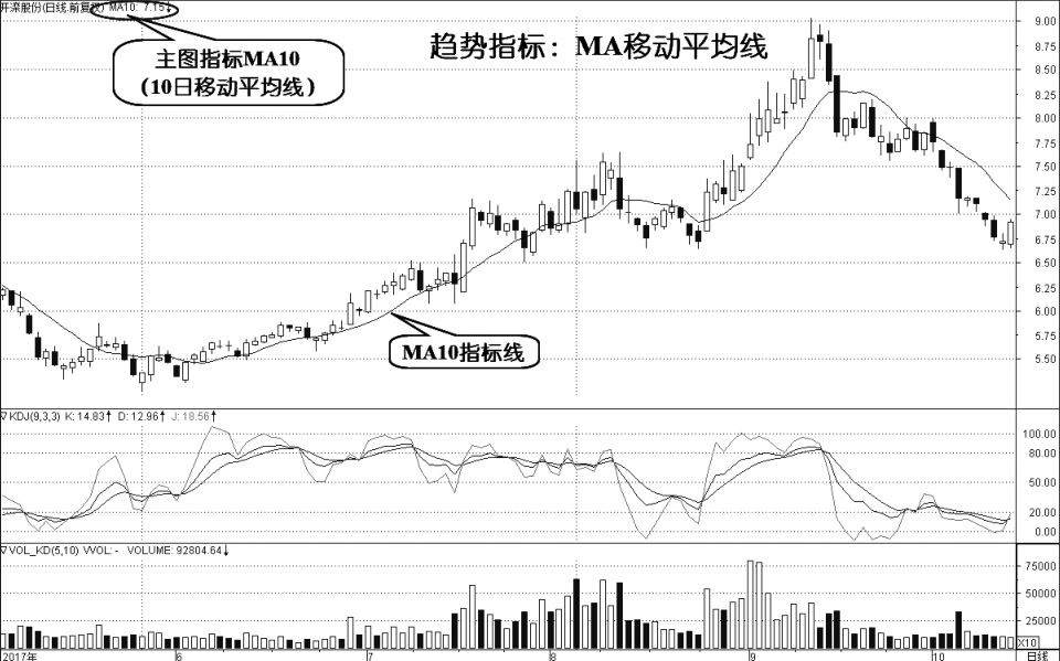 趋势指标是以描述趋势行情见长的指标。趋势行情是指比较流畅的、明显的单边上涨或下跌行情,具有明显的趋向性,其走势特点为,股价沿着趋势指标线行进,比如在一波中短线的上涨趋势行情中,股价会沿10日移动平均线(MA10)上升。常见的趋势指标有移动平均线(MA)、布林通道(BOLL)、薛斯通道(XS)、趋向指标(DMI)等等,趋势指标一般是股票软件中的主图指标,如常用的移动平均线MA10,见图1-1所示。