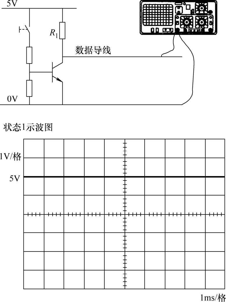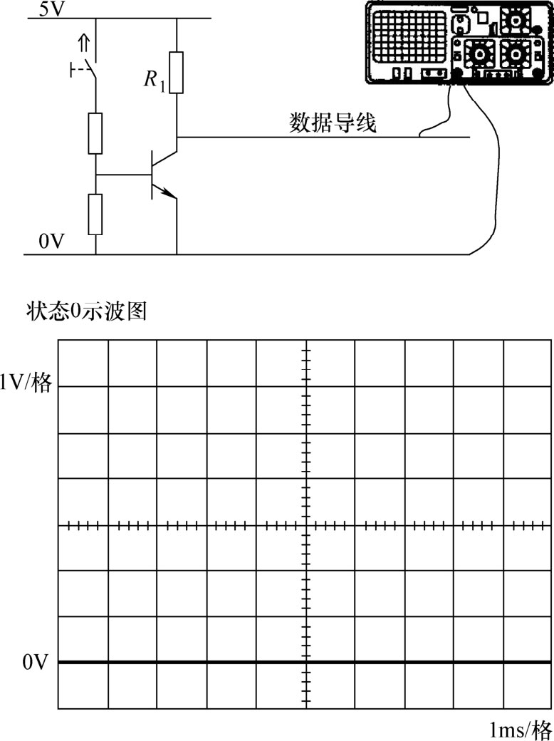 晶体管导通状态:晶体管受控制时条件发生了变化,因为集电极-发射极导通形成了电路。因此示波图中的电压值从5V降到约0.2V,以二进制表示时,数据导线处于状态0,如图1-37所示。