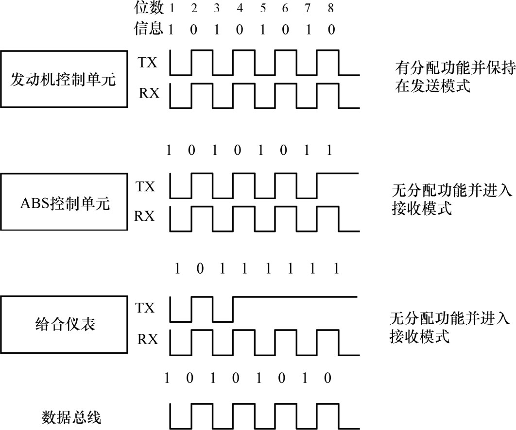同理,发动机控制单元和ABS控制单元继续向外发送信息的第5位、第6位、第7位(101),且这三位的信息是一样的,不存在冲突。再发送第8位,发动机控制单元的第8位为“0”,而ABS控制单元的第8位为“1”,根据三个收发器耦合在一根总线的原理,此时总线的状态应为“0”,对ABS控制单元来说,它向外发送“1”(TX状态1),但接收到是“0”(RX状态0),根据仲裁原则,ABS控制单元停止发送信息,转为接收状态,该信息等待下一次发送周期,再次请求发送。