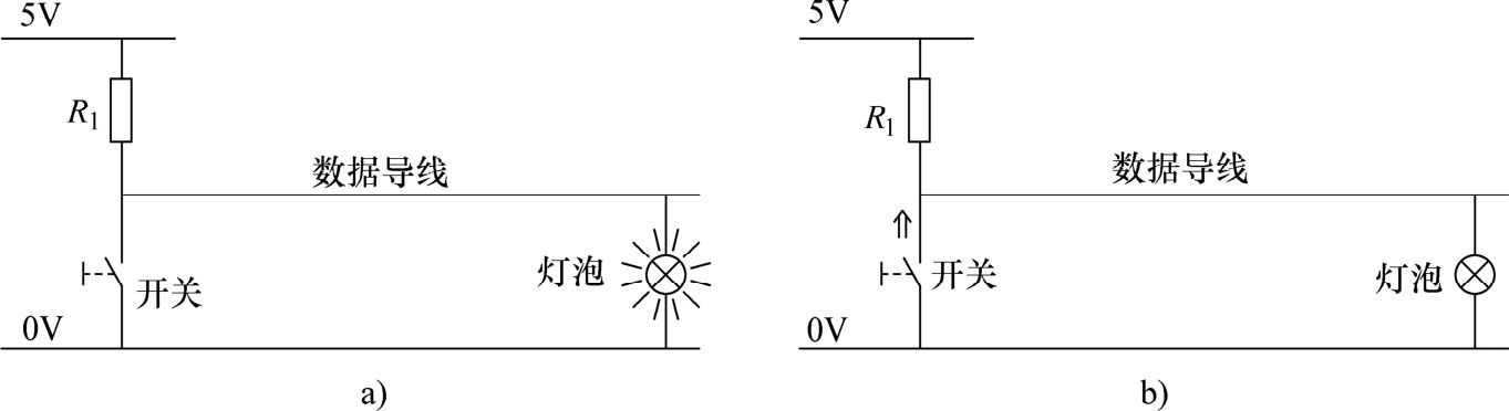 开关处于打开状态时,电阻 R 1 与灯泡串联。如果已根据灯泡标称电压(例如2.5V)调整电阻上的电压降,则灯泡亮起。此时数据导线上的电压值约为2.5V。以二进制方式表示时,这种情况为状态1,如图1-34a所示。