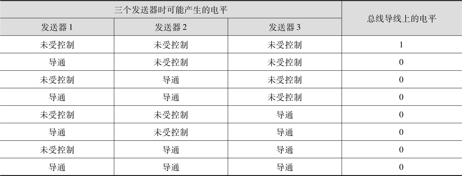 如果总线上布置了多个发送器,则同时发送时会造成信息重叠。有三个总线设备时,在总线电平方面可能出现以下情况: