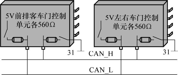 3)在低速总线中,一个电阻在CAN_L导线与收发器供电之间切换,另一个电阻在CAN_H导线与接地之间切换。将点火开关置于关闭位置时,无法从外部测量电阻值,因为两个电子开关断开了供电与接地之间的连接。