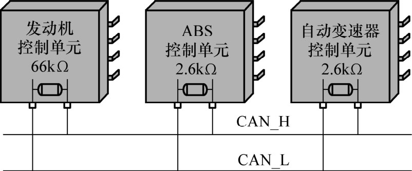2)电阻在控制单元内的布置:与标准规定在数据总线两端布置终端电阻(为120Ω)不同,在高速总线(CAN)上汽车制造商最常使用的是分布在控制单元上的负载电阻,如图1-45所示。在低速总线(CAN)中终端电阻不连接在CAN_H与CAN_L之间,而是对地或对5V切换,如图1-46所示。