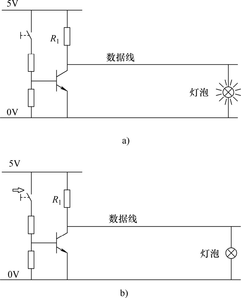 晶体管未受控制时,电阻 R 1 不与负极直接连接,电阻与灯泡一起构成一个串联电路。相应数值匹配时,灯泡亮起且数据导线上产生二进制状态1,如图1-35a所示。