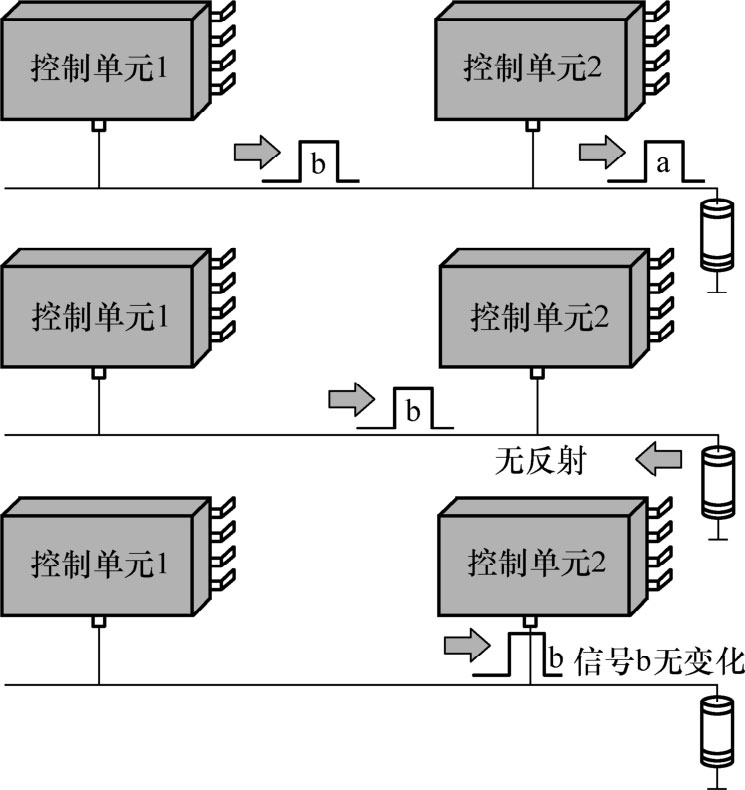在高频网络中总线导线端部必须有终止点,否则可能会出现反射。这种情况也适用于至总线设备连接部位的导线端部。对于高频信号来说,总线导线端部的作用相当于独立的发送器。因此导线端部会产生反向运行的信号,这些信号叠加在有效信号上并造成信号失真。例如,各控制单元扫描时不识别为1,而是识别为0,如图1-43所示。