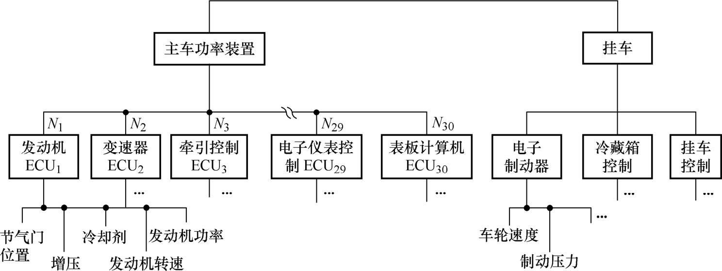 采用J1939标准的分级式,将整个网络分成不同功能层级,并用特制的微机对不同层级进行处理和控制。分级式网络布局如图1-47所示。这种网络布局具有超过30个ECU的容量。