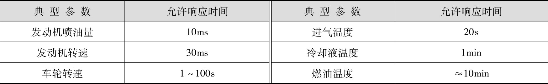 汽车内ECU之间与办公用微机之间的数据传输特征不尽相同,主要差别在于传输频率。汽车内ECU之间的数据传输频率是变化的,在一个完善的汽车电子控制系统中,许多动态信息必须与车速同步。为了满足各子系统的实时性要求,有必要对汽车公共数据实行共享,如发动机转速、车轮转速、加速踏板位置等。但每个ECU对实时性的要求是因数据的更新速率和控制周期不同而不同的。例如,一个8缸柴油机运行在2400r/min,则ECU控制两次喷射的时间间隔为6.25ms,其中,喷射持续时间为30°的曲轴转角(2ms),在剩余的4ms内需完成转速测量、油量测量、A-D转换、工况计算、执行器的控制等一系列过程,这就意味着数据发送与接收必须在0.25ms内完成,才能达到发动机电控的实时性要求。这就要求其数据交换网是基于优先权竞争的模式,且本身具有极高的通信速率,CAN现场总线正是为满足这些要求而设计的。不同参数应具有不同的通信优先权,表1-17列出了几个典型参数允许响应时间。