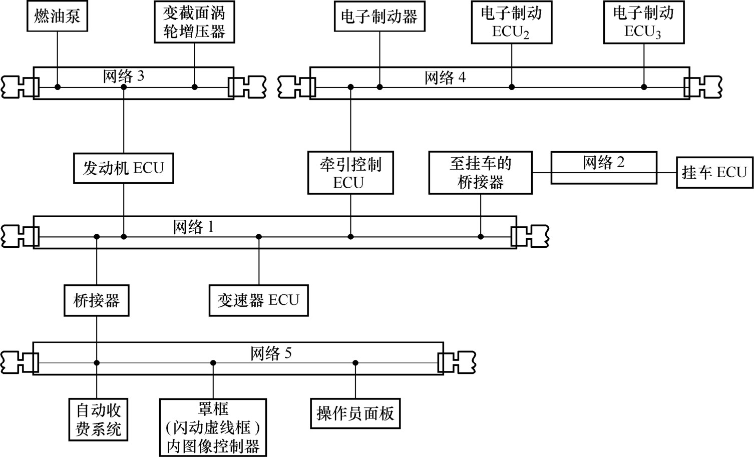 采用J1587/J1708标准的分开式网络布局如图1-48所示。在这种网络布局中,各个网络都有自己的操作系统,相互之间用桥接器来处理多个ECU之间的通信。