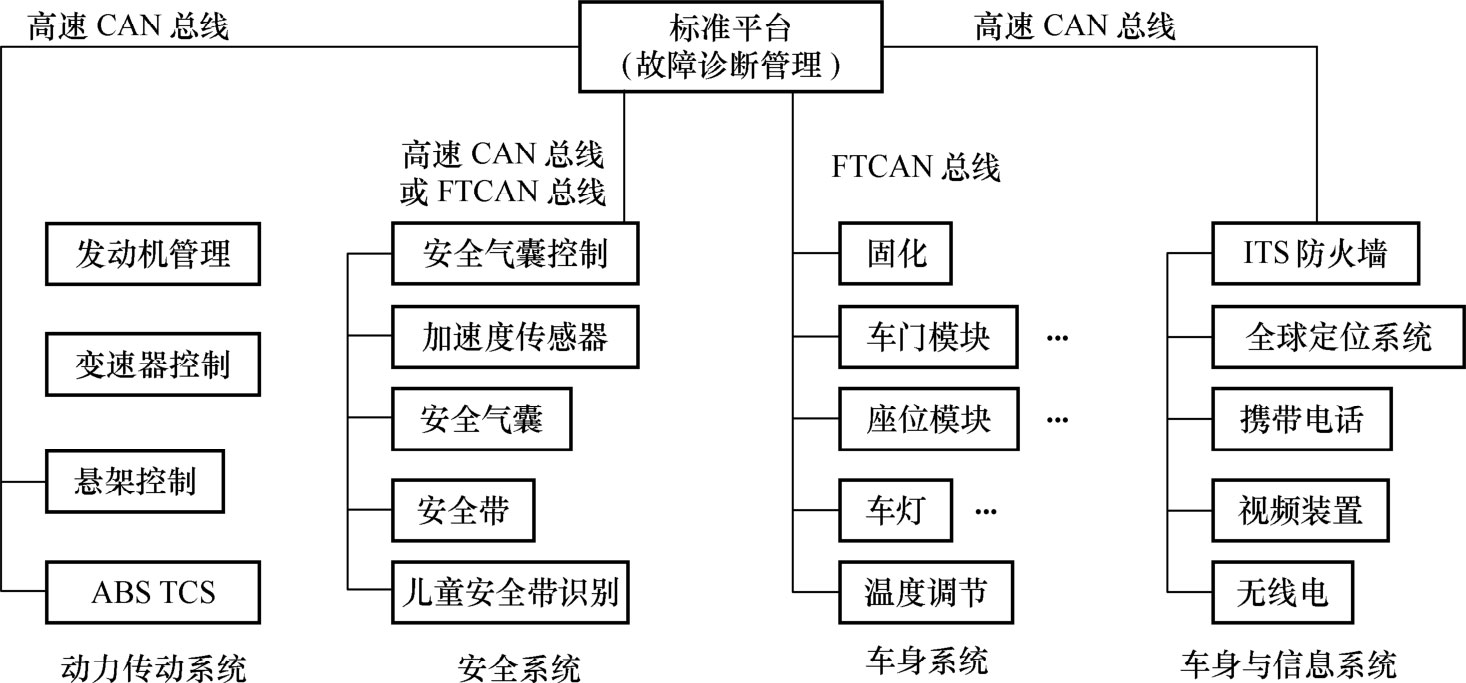 除上述所介绍的系统之外,还有面向21世纪的控制系统、高速车身系统及主干网络等,这就意味着将会有不同的网络并存,因此就要求网络之间可以互相连接,也可以断开。为了实现即插即用,都将各个局域网与总线相连,根据汽车的平台选择并建立所需要的网络。典型的车用网络如图1-50所示。