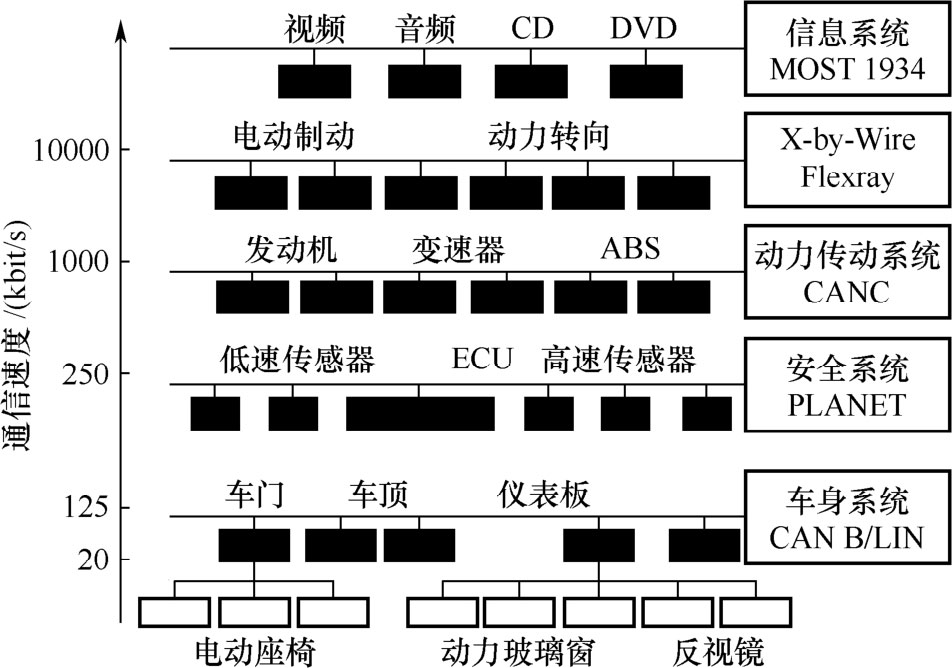 车载网络系统在汽车上的应用非常多,按照应用系统加以划分的话,车载网络大致可以分为4个系统:动力传动系统、车身系统、安全系统和信息系统。车载网络系统的应用等级如图1-49所示。