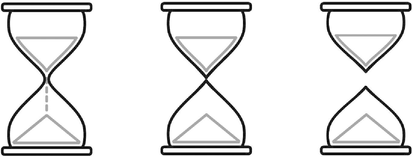 在这三种可能的沙漏中,当沙漏中间部位缩得太紧时(这可以用描述颈部直径的一个参数来定义),沙漏就将不再起作用(中间的图)。最后,当极端缩紧时,沙漏会呈现出不可能的形状(右边的图)。