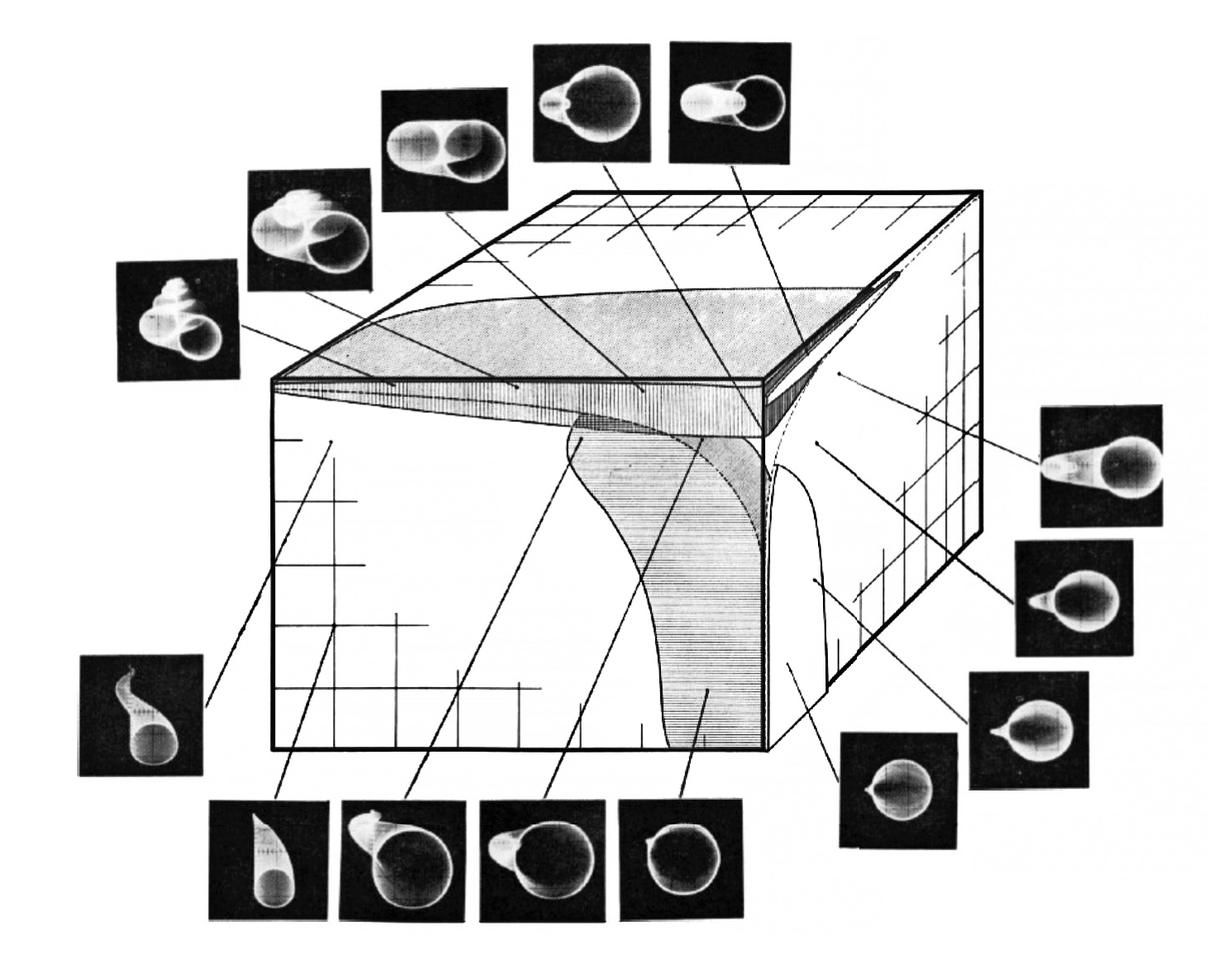 立方体的三个轴分别定义了三个参数,这些参数在不同的壳体之间是不一样的,由此它们为所有可以想象的壳体类型确定了一个形态空间。在图中,作为例子的壳体以黑色显示。只有部分形态空间(在图中以灰色突出显示)已被壳体占据,其余部分则从未有过壳体的任何一个实例。