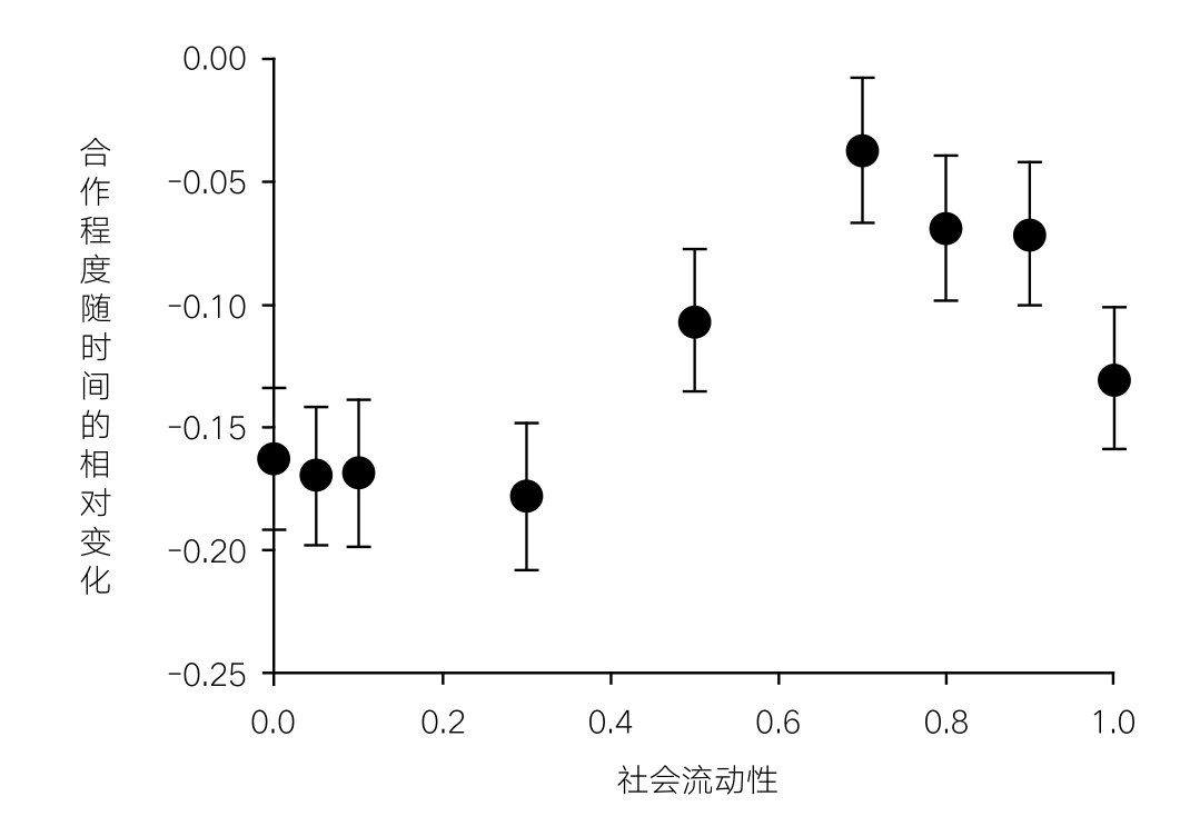 本图显示了社会流动性与合作程度之间的关系。横轴表示社会流动性,取值范围为从0(从不)到1.0(总是);纵轴表示实验创建的社会网络群体中采取合作的被试的合作程度。当社会流动性很小或不存在社会流动性时(也就是说,当人们被邻居困住时),合作程度较低。与此类似,当社会流动性非常高时(即当人们的邻居经常变化时),合作程度也很低。合作程度最高的情况出现在那些具有中间流动性的群体中。