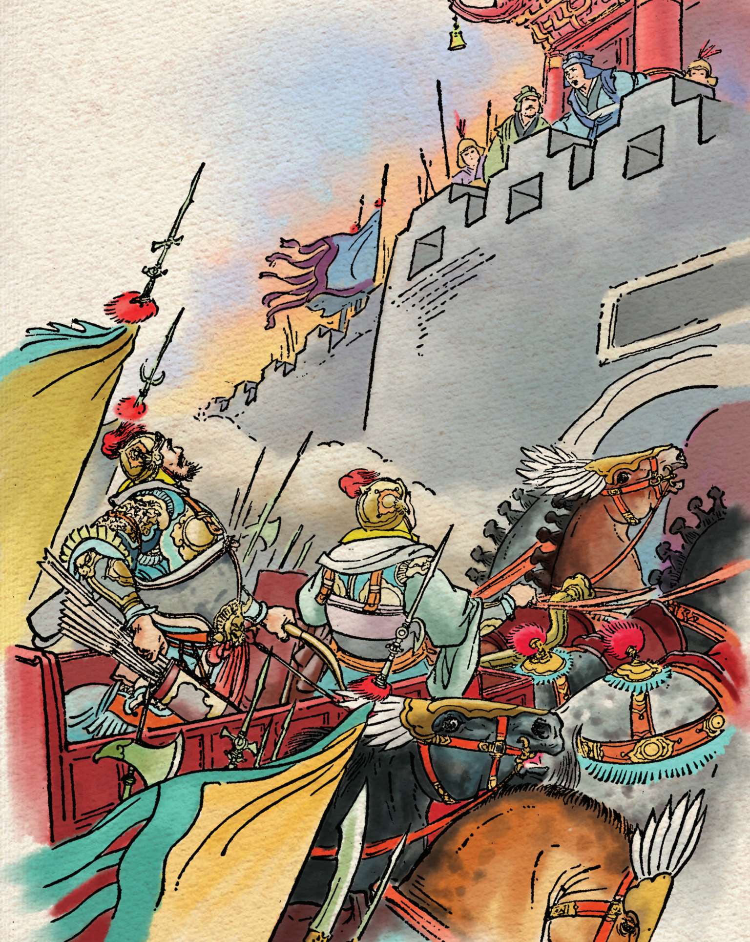 又过了一个月,中山国国君还不投降。乐羊可就开始攻城了。姬窟眼瞧着中山城守不住,就叫公孙焦把乐舒绑在城门楼子上,准备杀他。乐舒朝城下嚷着说:“父亲救命!”中山国的大夫公孙焦对乐羊说:“赶快退兵,你儿子还有活命;你要是再攻城,我们可就要拿他开刀了!”乐羊骂乐舒说:“你当了大官,不能劝告国君改邪归正,又没法儿守城,投降又不投降,抵御又不抵御,还像个吃奶的孩子叫唤什么?”他拿起弓箭来,准备射上去。公孙焦叫人把乐舒拉下来。他对姬窟说:“乐舒的父亲向咱们进攻,乐舒也不能说没有罪呀。”姬窟就下令把乐舒杀了。