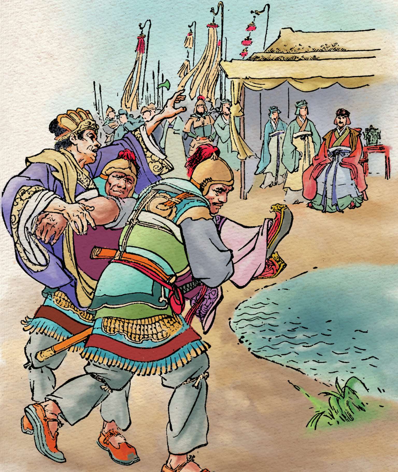 过了一会儿,西门豹说:“巫婆上了年纪,不中用,去了这么半天还不回来。你们年轻的女徒弟去催她一声吧!”接着“扑通、扑通”两声,两个领头的女徒弟又给武士们扔到河里去了。大伙儿笑了一声,嘁嘁喳喳地议论开了。他们一会儿望望河心,一会儿望望西门豹的脸。又过了一会儿,西门豹说:“女人不会办事,还是烦出头办事的善士们辛苦一趟吧!”那几个经常向老百姓勒索的里长正想逃跑,早被一群老百姓挡住,一个一个都给武士抓住了。他们还想挣扎,西门豹大声喝着说:“快去,跟河伯讨个回信,赶紧回来!”武士们左推右拽(zhuài),不由分说,把他们都推到水里,一个个喊了一声,眼看都活不成了。旁边看的人有的笑了,有的手指头指着河心,直骂这几个坏蛋。西门豹向大河行个礼,挺恭敬地又等了一会儿。看热闹的人当中有的害怕,有的喜欢,有的咬牙,可是谁也不愿意走开,都要看个究竟。