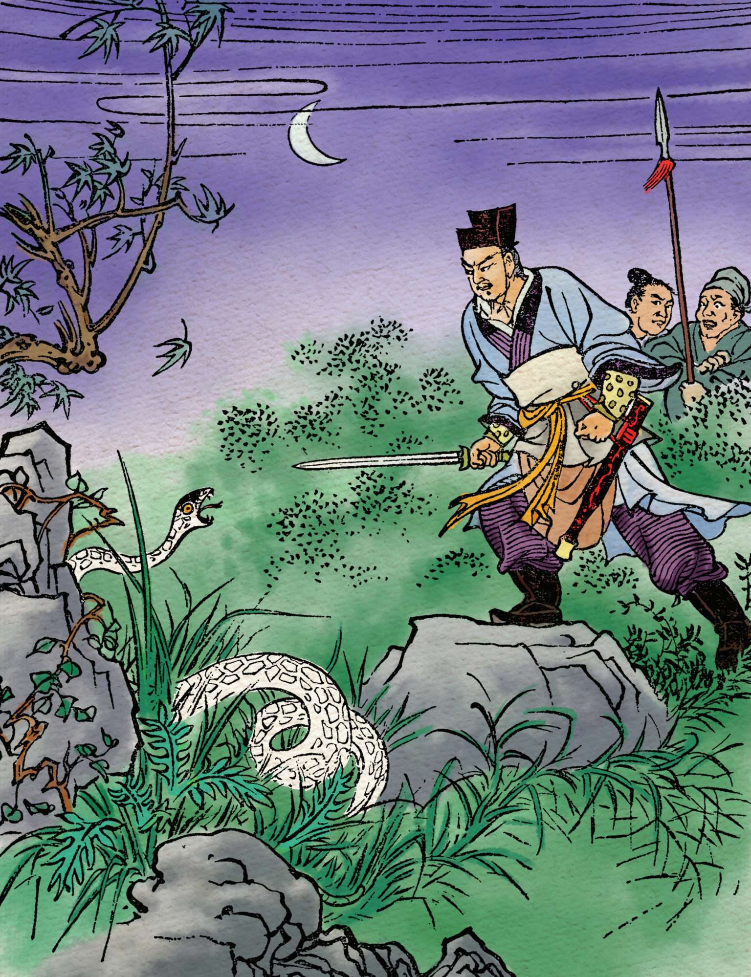 那天晚上,刘邦他们不能再住客店。刘邦又喝了不少酒,这才醉醺醺地带着这十几个人往洼地那边走去。刘邦东倒西晃地走得慢,有三五个人跟着他落在后头。走了一阵子,月亮出来了。他们不敢走大路,就拣小道走。不知道怎么着,前面的人忽然撒腿往回跑,吓得后面的人还以为碰到了官兵。这一下子倒把刘邦的酒吓醒了。他跑上一步,着急地问:“出了什么事儿啦?”他们说:“前面有条大蛇横在道儿上,大极了。咱们还是走别的道儿吧。”刘邦听说是条蛇,倒放心了。他说:“壮士走道儿,还怕蛇吗?”他就跑在头里,拔出宝剑,提在手里,过去一瞧,果然是一条挺大的白蛇。他举起宝剑来,一下子把那条蛇剁成两截。大伙儿这才继续往前走去。