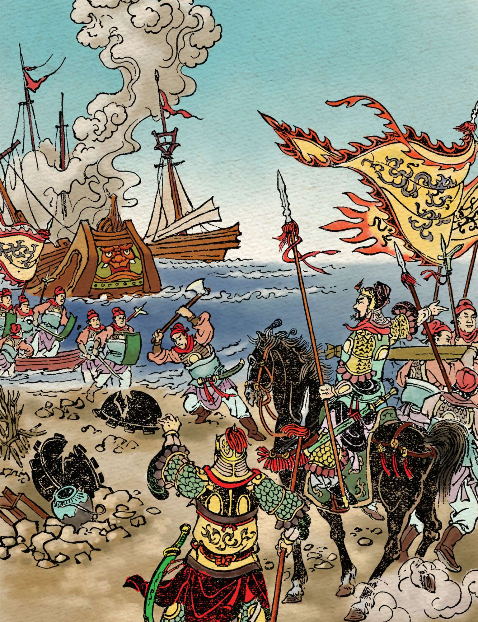 项羽杀了宋义,派英布和蒲将军带领两万人马渡过漳河。章邯听到楚军渡河,就派了两个将军,一个叫司马欣,一个叫董翳(yì),带领几万士兵前去拦阻。那两个秦将不是英布和蒲将军的对手,一交锋就打了败仗,急忙后退。项羽看英布和蒲将军已经占领了对岸,就率领所有的军队都渡过河去。等到全军都渡过来了,他吩咐士兵,各人带上三天干粮,把军队里做饭的锅都砸了,把船都凿沉了(文言叫“破釜沉舟”;釜fǔ,就是锅)。他对将士们说:“成败在此一举。这次咱们打仗,只准进,不准退;三天里头一定把秦兵打败!你们看行不行?”将士们举起拳头,一齐嚷着说:“行!行!”