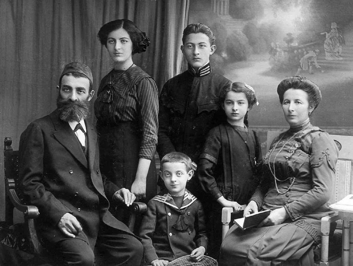 照片上每个人的表情都很严肃,特别是旅馆老板平卡斯,他蓄着黑胡子,穿着虔诚犹太人的长外衣,眼神诧异地盯着相机。马尔卡看起来紧张而庄重,是一位身形丰满、头发一丝不乱的女士,穿着一件带蕾丝花边的长裙,戴着一串沉甸甸的项链。一本打开的书放在她的腿上,这是在向理念世界致意。埃米尔是1893年出生的长子,穿着军服佩戴着领章,即将奔赴战场,那时的他并不知道他将死在战场上。在他旁边站着的是古斯塔,小他4岁,姿态优雅,比她的哥哥还要高1英寸。在他前面的是1899年出生的妹妹劳拉,她正抓着椅子的扶手。我的外祖父莱昂在最前面,那时他还是个穿着水手服的小男孩,眼睛睁得大大的,露出一双大耳朵。在快门按下的瞬间,只有他一个人在微笑,仿佛对其他人的肃穆毫不知情。