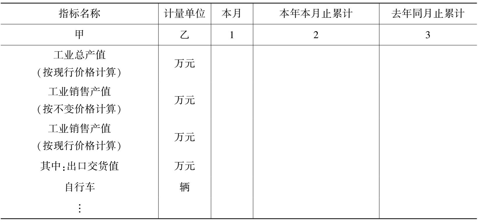 统计报表的资料来源于基层单位的原始记录。原始记录是基层单位以一定表格、凭证、账册对本单位经济活动的具体内容及状况所做的直接记录。所谓直接记录,是指“第一次记录”,凡是转录和推算、估计的资料均不视为原始记录。表2.1为工业生产、销售总量及主要产品产量月报表。