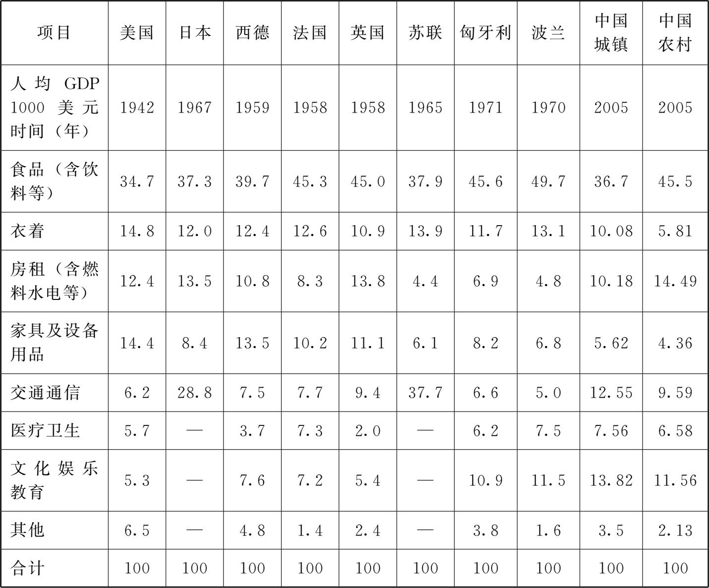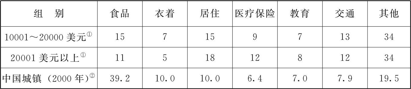 世界各主要发达国家和当前的中国,在人均收入1000美元时的消费结构也基本相近(表2.1.6),食品、衣着等生存型消费占有较大比重,反映了在较低收入水平下,消费结构受消费水平制约的基本特点。