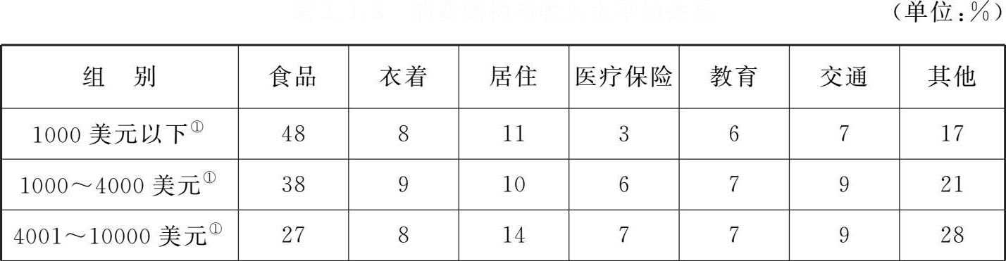 表2.1.5 消费结构与收入水平的关系