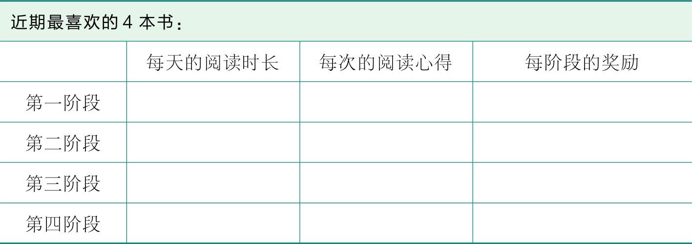 使用规则:(1)首先选出4本近期最喜欢、最想读的书;(2)将1个月分为4个阶段,确定每个阶段中每天的阅读时长;(3)确定每次阅读之后想要写多少字的心得体会;(4)确定每个阶段的阅读计划完成之后给自己什么样的奖励。见表2-2。