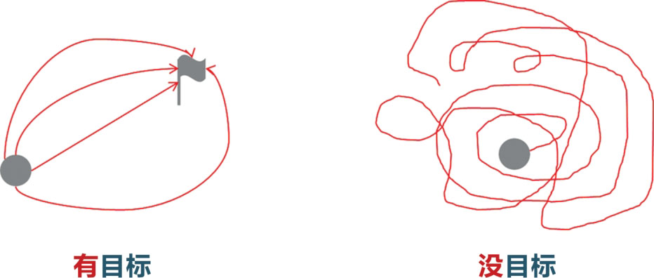 图2-1右图表示的是没有目标的状态。我们能看到,在出发之后都不知道该往哪里走,一直在围绕着中心点转圈圈,根本没有方向性可言。如果拿出一本书,不由分说,想都不想就翻看里面的内容,看过之后,可能还是会觉得迷迷糊糊的,好像看了很多,但是不知道自己学了多少,理解了多少。