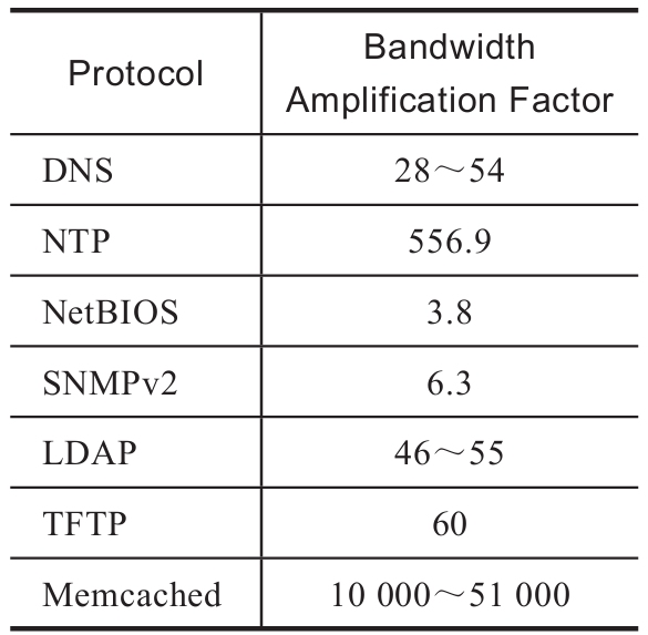 在Amplification Attack中,有可能被利用的服务包括很多种,例如Domain Name System(DNS)、Network Time Protocol(NTP)、Trivial File Transfer Protocol(TFTP)、Mem-cached等。当然,每种服务的BAF也不尽相同,表2-3整理了一些比较常见的协议和服务以及所对应的BAF。