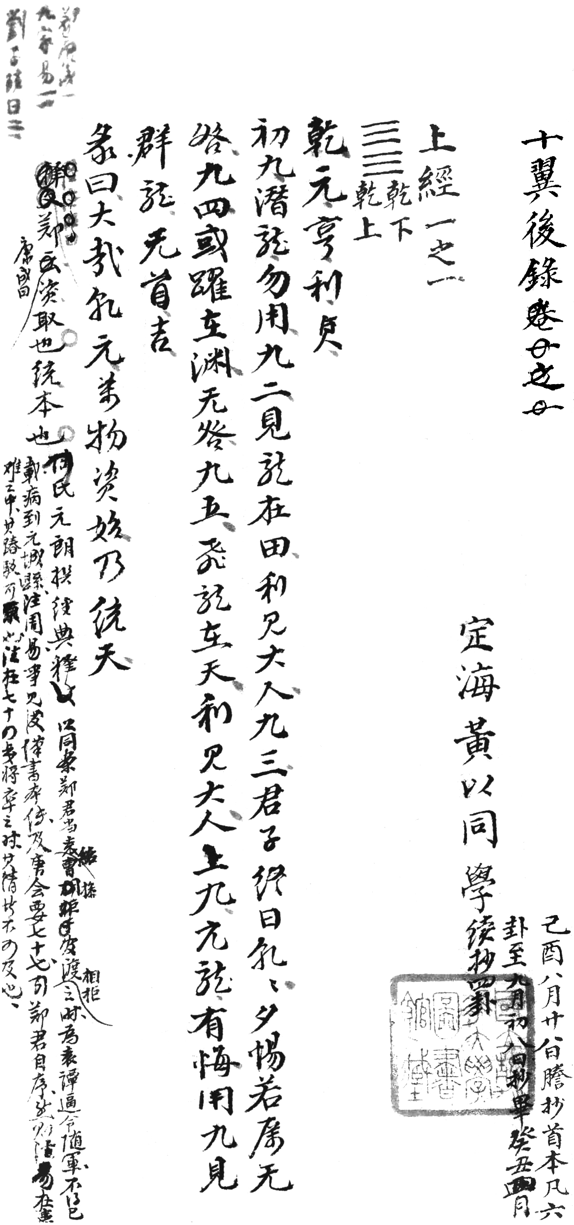 等稿成和誊抄时间以及钤印,可知该稿成于道光末咸丰初,为诸本中最早。根据该本序跋,每卦记述的校阅时间,黄式三的私章、书斋和藏书章及大量的眉批、旁注、补删、浮签等内容,该本当为黄式三的校阅本。只是其后黄以周一直随身宝藏,屡有更订。该本于2008年被列入中华人民共和国文化部公布的第一批国家珍贵古籍名录。
