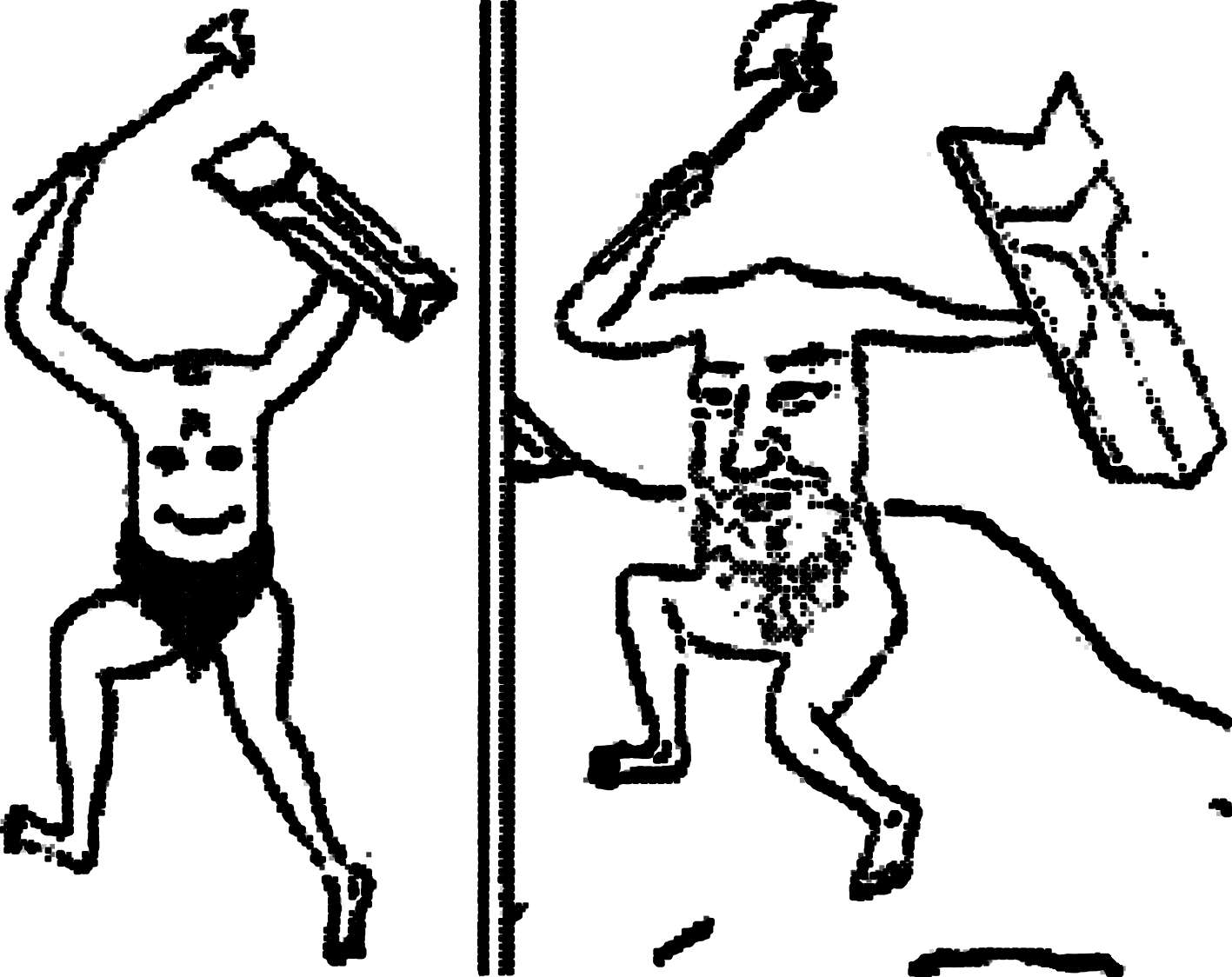 失去头的刑天(就像“帝江”那样成为一个大囊袋)并没有屈服,它以双乳做眼睛,用肚脐做嘴,手里挥舞着大斧头和盾牌,舞动着。他还保留着最初的气团的形态,飞旋着,舞动着(“常羊”就是“徜徉”,是盘旋的意思)。
