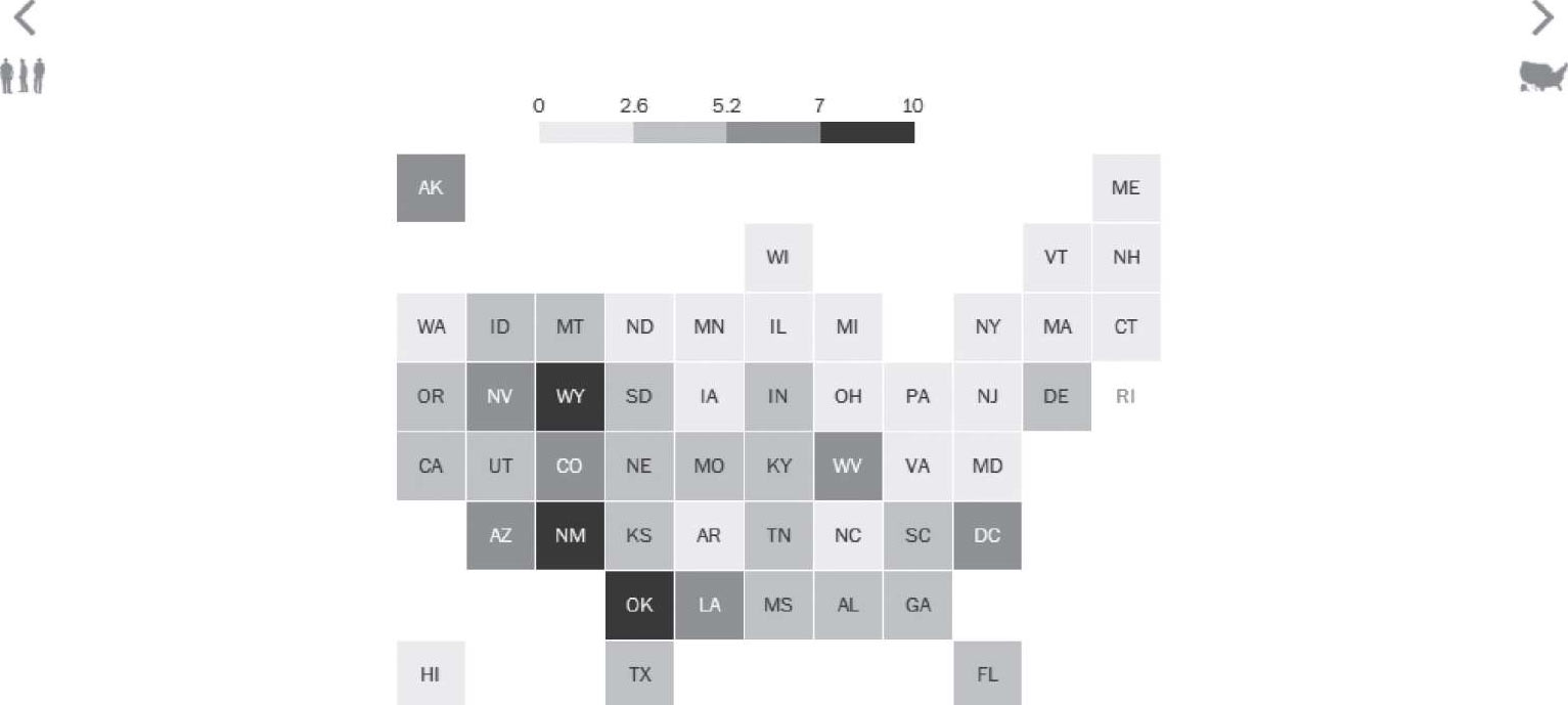 西方新闻报道中有“华尔街日报体”,它被视为宏观叙事与微观叙事结合的典范。这种写作方法的要求是从某一具体的事例(人物、场景或细节)写起,经过过渡段落,进入新闻主体部分,之后又回到开头的事例中,从叙事的层次看是“微观层面—宏观层面—微观层面”,兼具人情味、故事性,多用于特稿写作中。但“华尔街日报体”的微观叙事其实是讲一个微观个案的故事,它的本质是增强报道的趣味性,通过“以小见大”和移情的方式让受众深刻地理解报道内容。数据新闻将宏观叙事与微观叙事的结合走得更远,它的微观叙事不是投射到某个个案,而是通过互动和个人化的方式为受众提供有针对性的个性化叙事内容。例如,《华盛顿邮报》获普利策新闻奖的作品《今年被警察射杀的人》(People Shot Dead By Police This Year),既有从宏观层面对美国2015年被警察枪击身亡事件的总体叙述,也有从中观层面对各州发生类似事件的概率的统计(见图2—6)。更为重要的是,受众可以针对自己感兴趣的内容进行信息筛选,点击所在州、性别、种族、年龄、携带武器类型、是否患有精神疾病、危险等级等的选项,查看图表、案件简介、报道文字、视频等(见图2—7)。