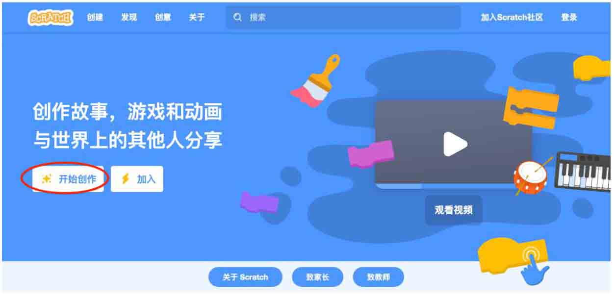 01 Scratch 3.0有离线版,也有在线版。可以直接在线编程,然后保存、上传,分享给我们的小伙伴。输入网址 https://scratch.mit.edu/ ,单击 开始创作 ,就可以很快地进入Scratch 3.0的编程世界。或者单击菜单栏中的 创建 ,进入编程界面。