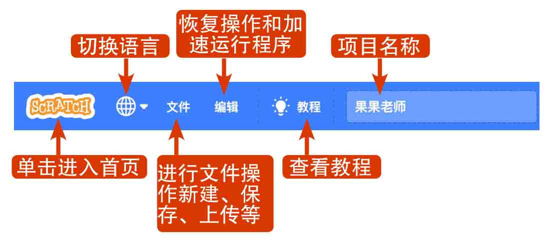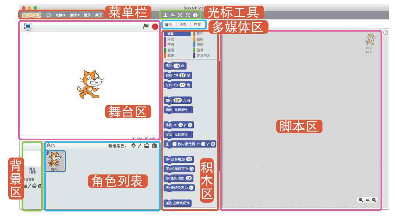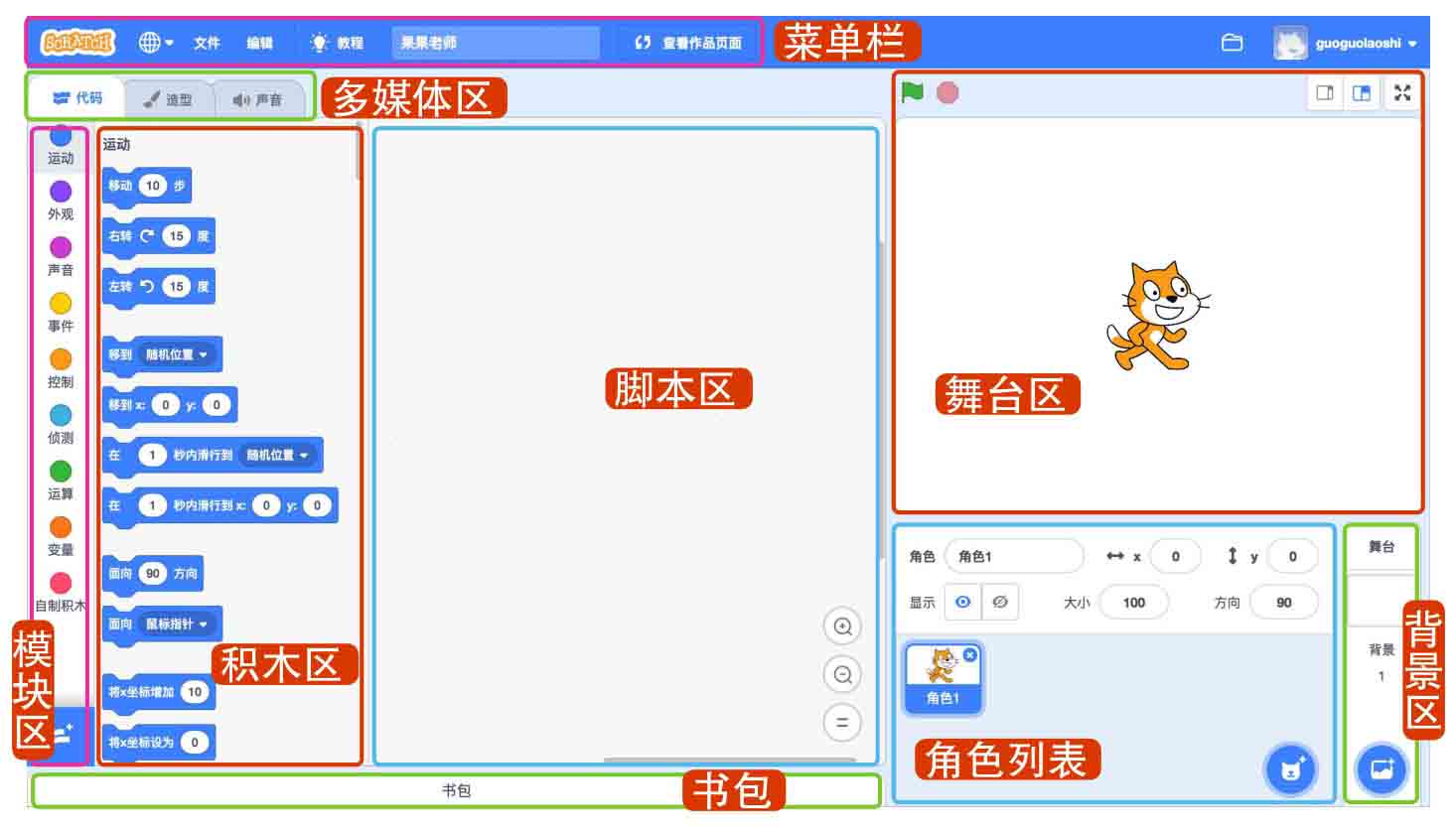 Scratch 3.0软件界面可以划分为菜单栏、多媒体区、模块区、积木区、脚本区、书包、舞台区、角色列表、背景区。