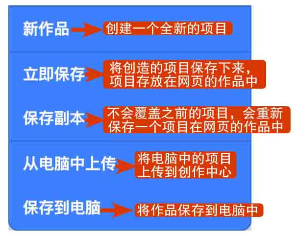离线版的文件操作有些不同,它只有 新建项目 、 从电脑中上传 、 保存到电脑 3个操作。