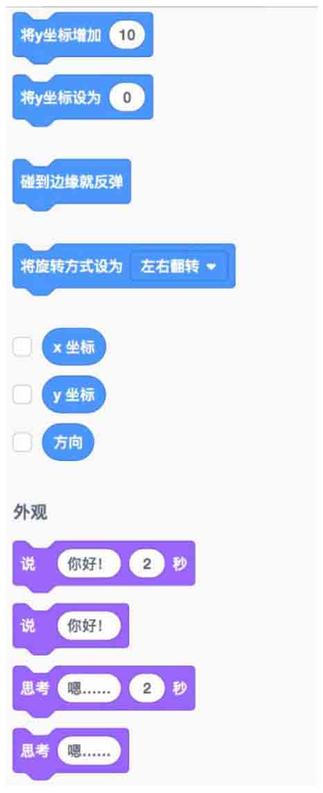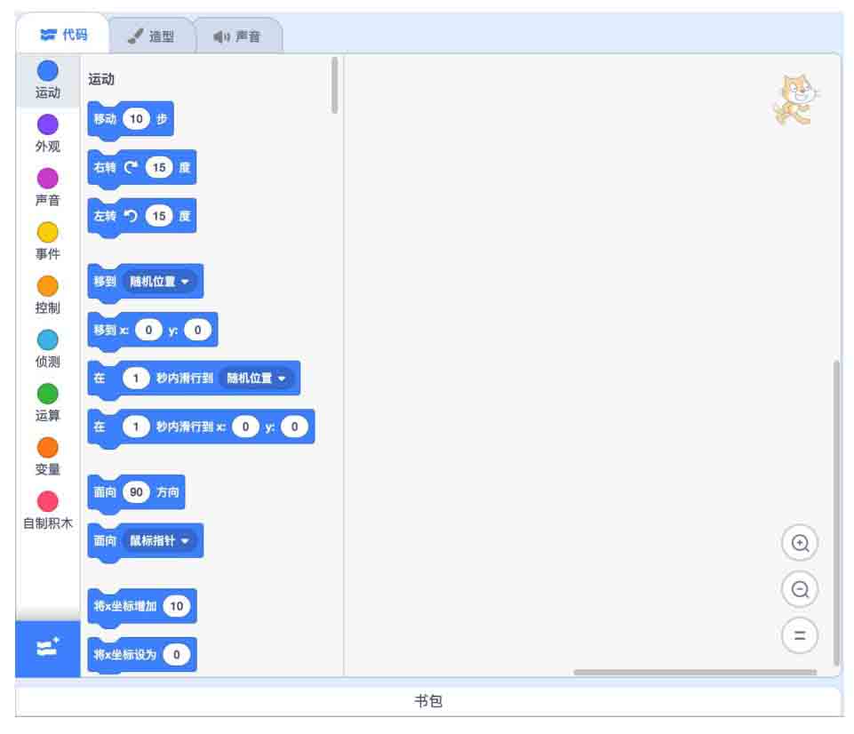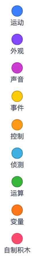 每一个颜色小圈圈代表了一大类的积木模块,同时每一类积木块都拥有和对应小圈圈相同的颜色。这些模块分别是运动模块、外观模块、声音模块、事件模块、控制模块、侦测模块、运算模块、变量模块、自制积木模块。